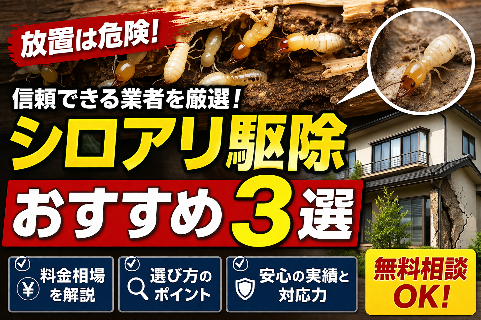 シロアリ駆除でおすすめの業者を厳選紹介。料金相場や選び方もわかりやすく解説しています。今すぐ無料相談で被害をチェック。